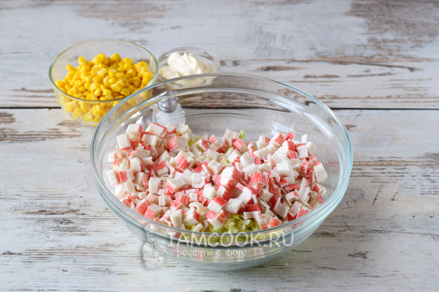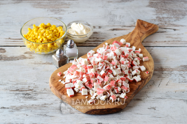 Мелким кубиком нарезаем крабовые палочки.