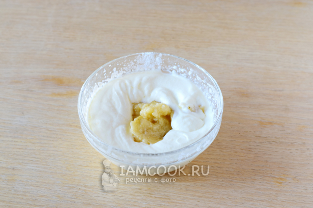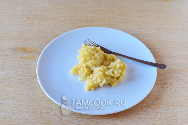 Банан хорошо разминаем вилкой или пробиваем в блендере до однородности. Мы любим, чтобы в креме чувствовались кусочки банана, поэтому я просто размяла банан вилкой.