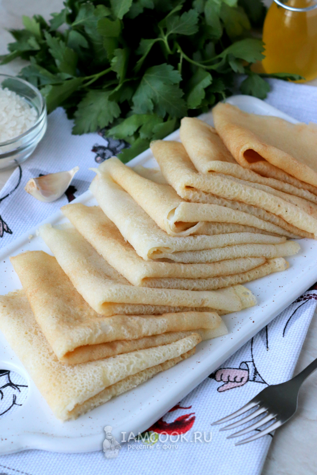Вот и всё, очень вкусные постные блины на рисовом отваре готовы. Они получаются не слишком сладкими, но эластичными, что даёт возможность завернуть в них любую начинку или подать на стол "пустыми", с разнообразными добавками.
