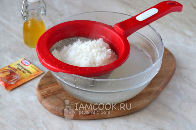 Затем рис откиньте на дуршлаг, а отвар сцедите в глубокую миску и дайте ему полностью остыть (у меня отвара получилось 0,5 л).