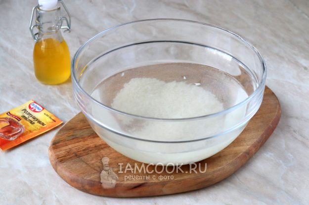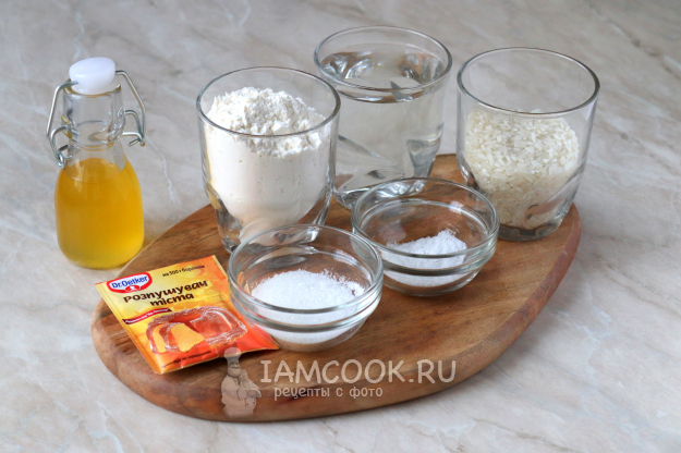 Для приготовления постных блинов на рисовом отваре подготовьте продукты по списку к рецепту.