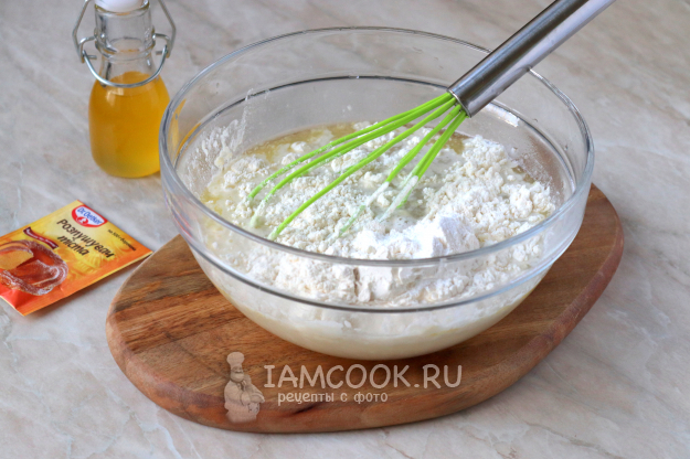 После чего введите просеянную пшеничную муку и разрыхлитель.