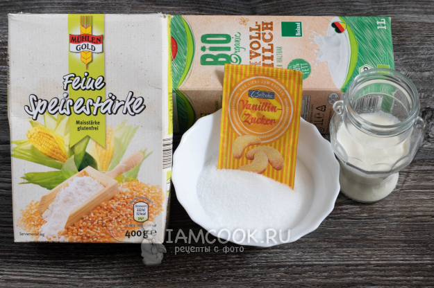 Подготовьте ингредиенты для приготовления пудинга со сливками. Обратите внимание, что крахмал должен быть кукурузным либо рисовым, но не картофельным.