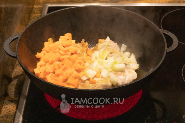 Добавьте лук и морковь и жарьте как минимум до достижения луком прозрачности.