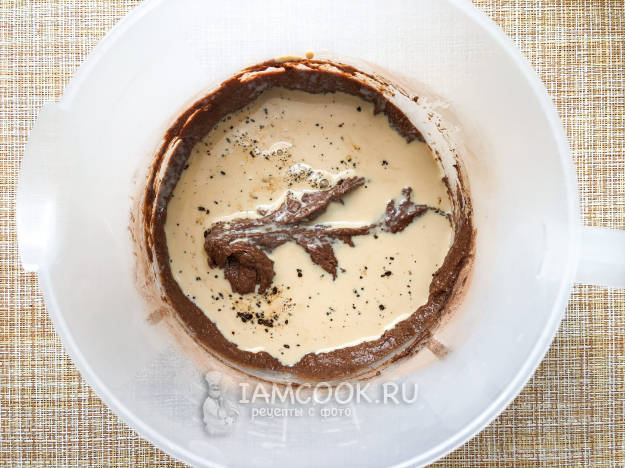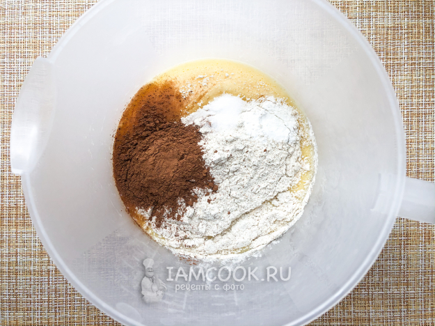 Добавьте муку, какао, соль и разрыхлитель. Снова взбейте до образования однородной массы.