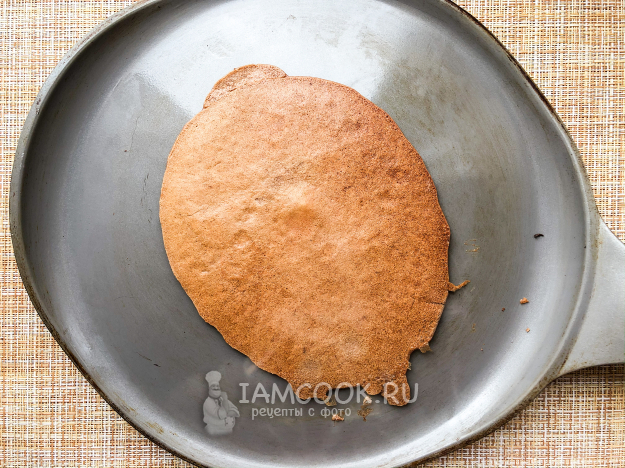 Испеките небольшие по размеру блины. Если не получится их сделать круглыми, не переживайте, просто потом вырежьте коржи круглой формочкой, чтобы торт получился ровным.