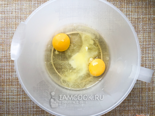 В глубокой миске соедините яйца, сахар, растопленное сливочное масло и подсолнечное масло. Взбейте все миксером до однородной массы.