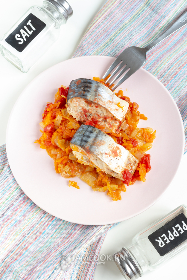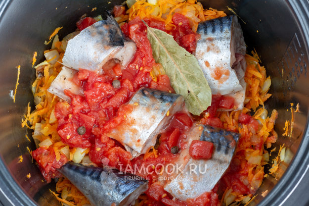 Теперь кладем кусочки скумбрии, перец душистый, лавровый лист и консервированные помидоры (у меня - кусочками). Включаем программу "Тушение" и тушим скумбрию с морковкой и луком в мультиварке 20 минут.