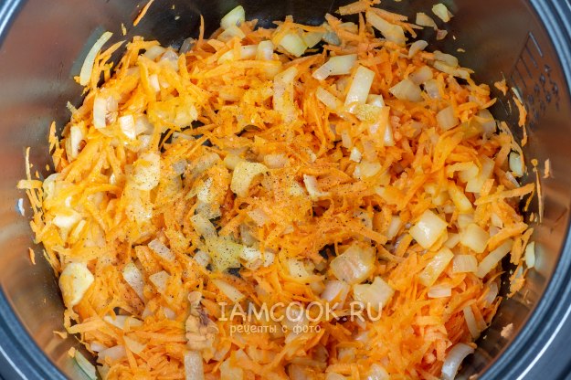 Кладем морковь к луку. Добавляем соль и перец в овощи по вкусу и жарим еще пару минут. На обжаривание овощей у меня ушло 11 минут. Поэтому программу "Жарка" я отключила раньше.