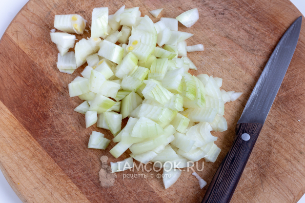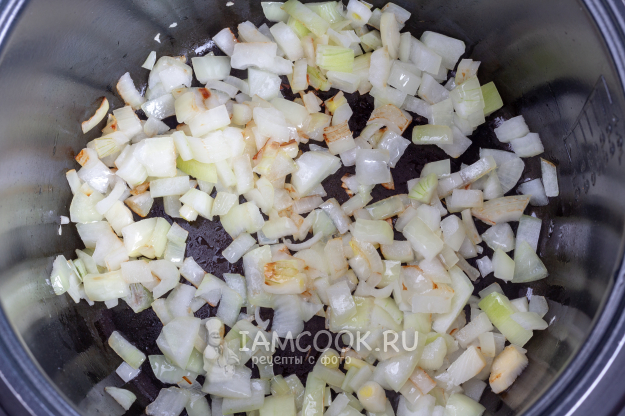 Отправляем лук жариться в мультиварку с небольшим количеством масла до прозрачности. Программу я установила "Жарка" на 15 минут.