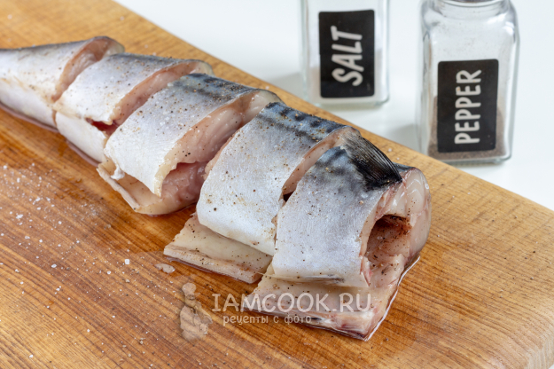 Первым делом необходимо рыбку порезать на кусочки и натереть солью с перцем.