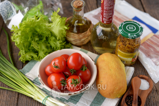 Подготовьте все продукты для салата BLT (с беконом, латуком и томатами). Овощи и траву помойте, обсушите.