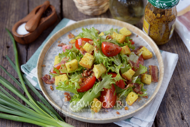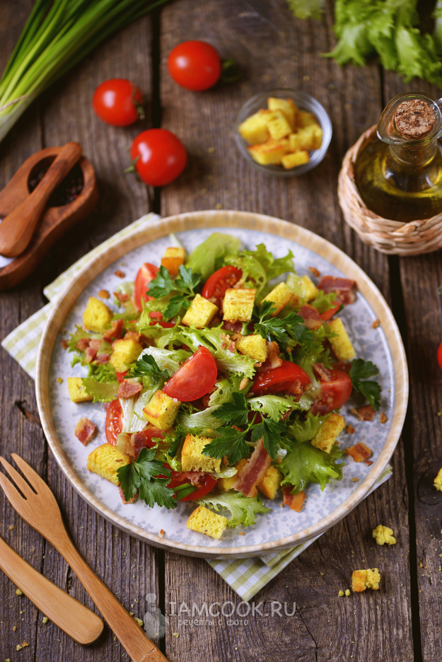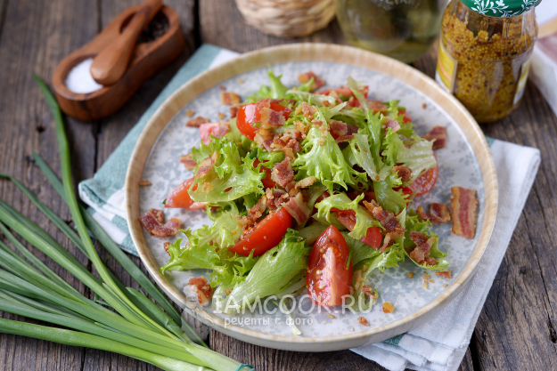 Ломти обжаренного бекона нарубите мелко ножом, посыпьте салат.