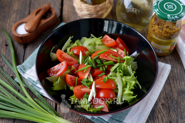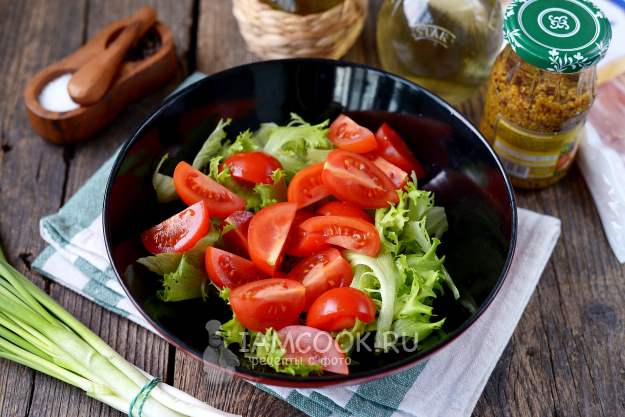 В глубокую миску сложите салат и нарезанные дольками помидоры черри.