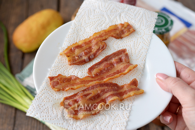 Переложите обжаренный бекон на бумажное полотенце, чтобы ушло лишнее масло.