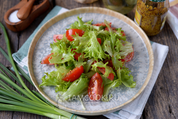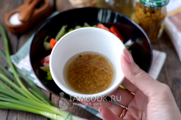 Смешайте в пиалочке масло, уксус и зернистую дижонскую горчицу. Заправьте ею салат, перемешайте.