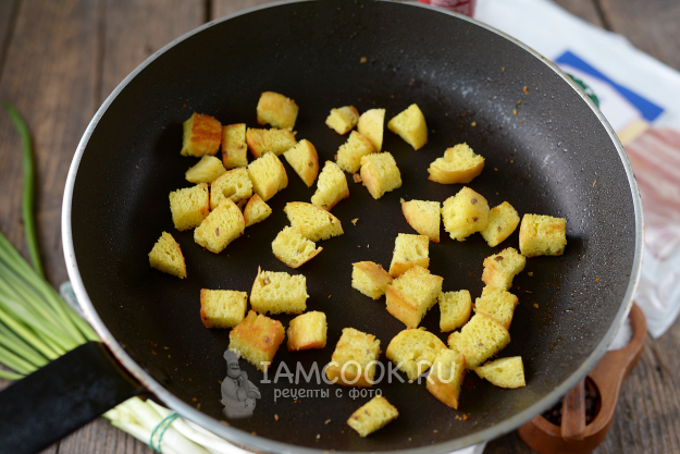 В этом же жире обжарьте до румяной корочки нарезанный кукурузный или белый хлеб до состояния сухариков.