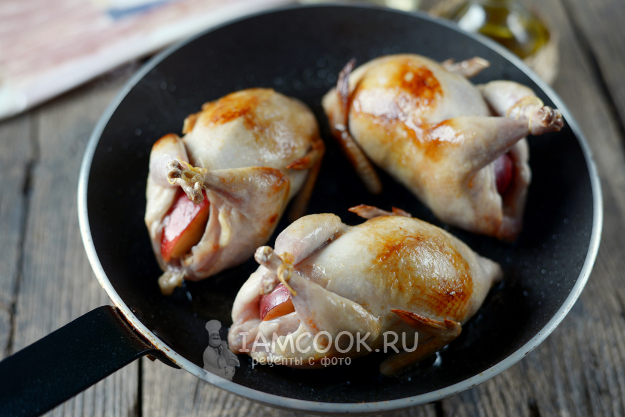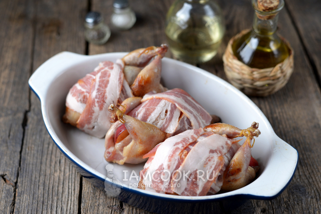 Переложите обжаренные тушки перепелов в форму для запекания, накройте грудку полосками бекона и отправьте в предварительно разогретую до 180 градусов духовку на 40 минут. При желании можно замотать ножки фольгой.