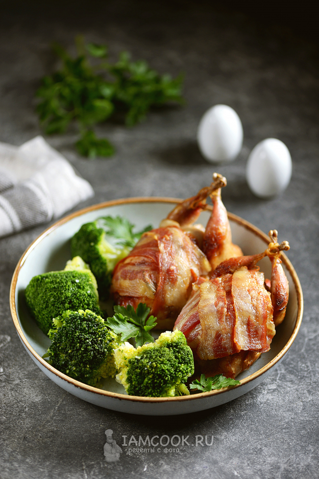 Вкуснейшие запеченные в духовке перепела с финиками, яблоком и беконом готовы. Я подавала с отварной брокколи.