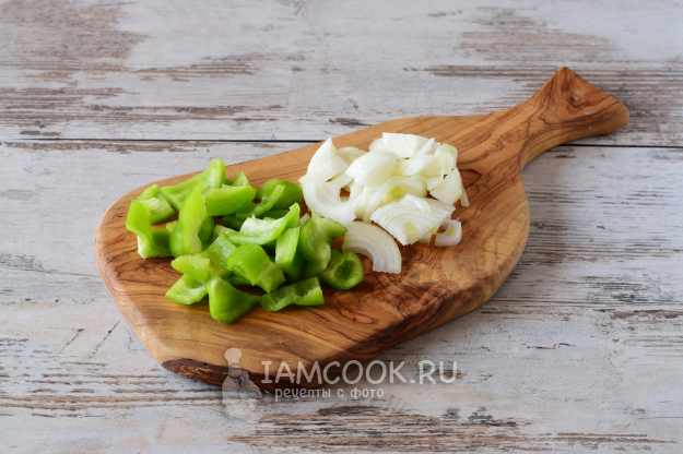 Очистим болгарский перец от семян и нарежем небольшими кубиками, лук репчатый нарежем четверть-кольцами.