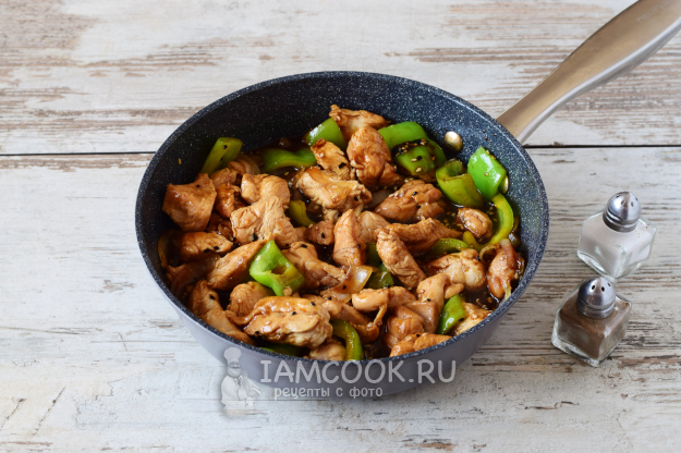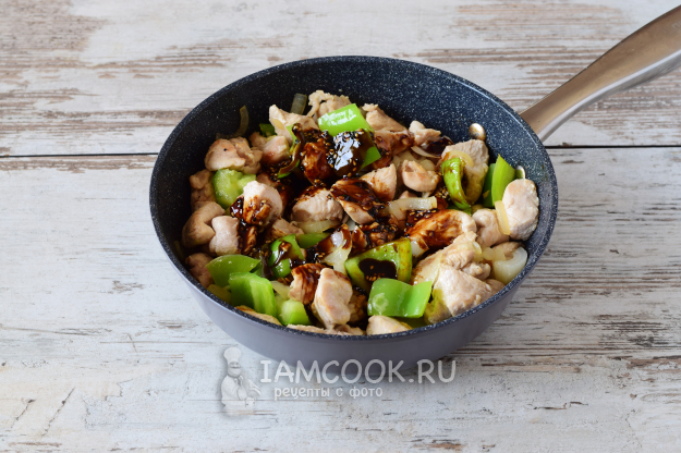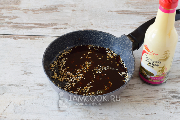 Добавляем соус терияки, хорошо перемешиваем содержимое сковороды.