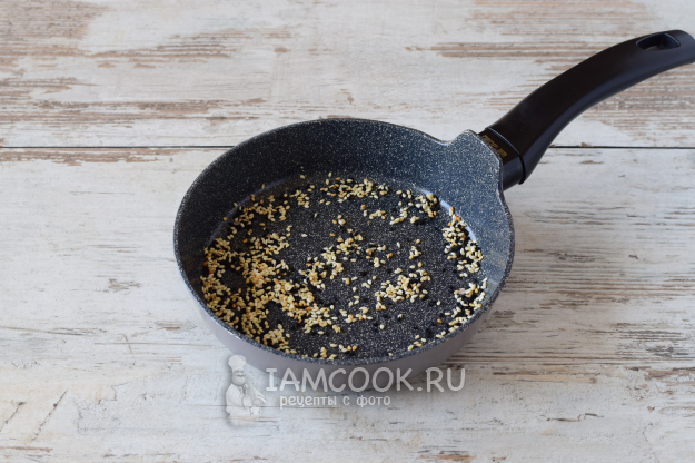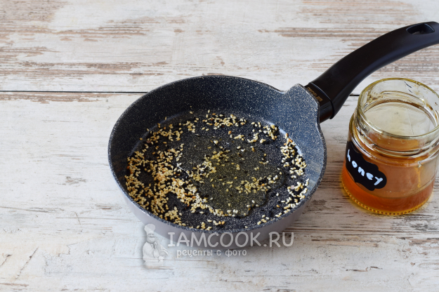 В отдельной сковороде на сильном огне обжарим кунжутные семечки 1-1,5 минуты, чтобы семечки раскрыли свой аромат.