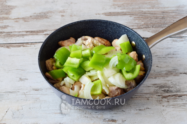 Добавим в сковороду к мясу овощи и готовим все вместе еще минут 5.