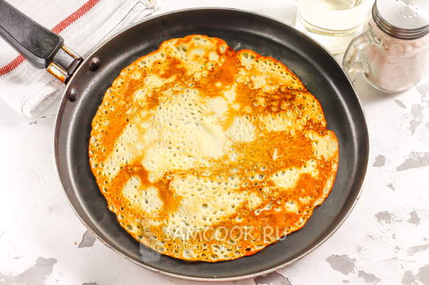 Затем раскалите сковороду и влейте на нее часть теста, округлите, чтобы получился блин. Обжарьте с каждой стороны по 1 минуте.