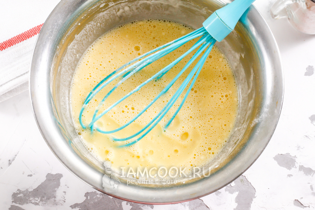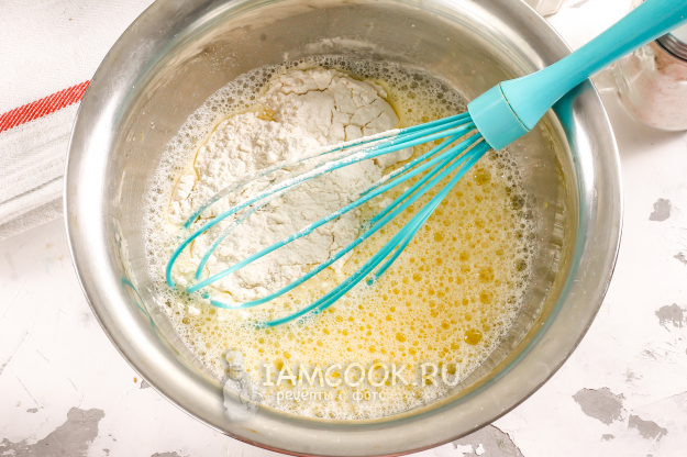 Всыпьте пшеничную муку и снова все взбейте венчиком.