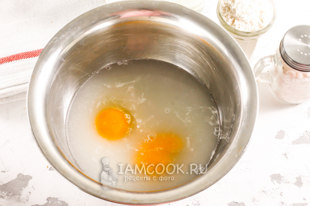 Вылейте его в глубокую емкость, всыпьте туда же соль и сахар, вбейте пару куриных яиц. Создавая несладкие блины, сахар исключите из списка ингредиентов. Взбейте все венчиком.