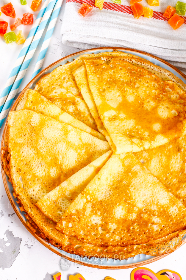 Кстати, в дни Поста вы можете удалить куриные яйца из списка ингредиентов и создать блины только лишь из оставшихся в списке продуктов, но тесту необходимо будет дать отстояться около 30-40 минут, перемешивая его.