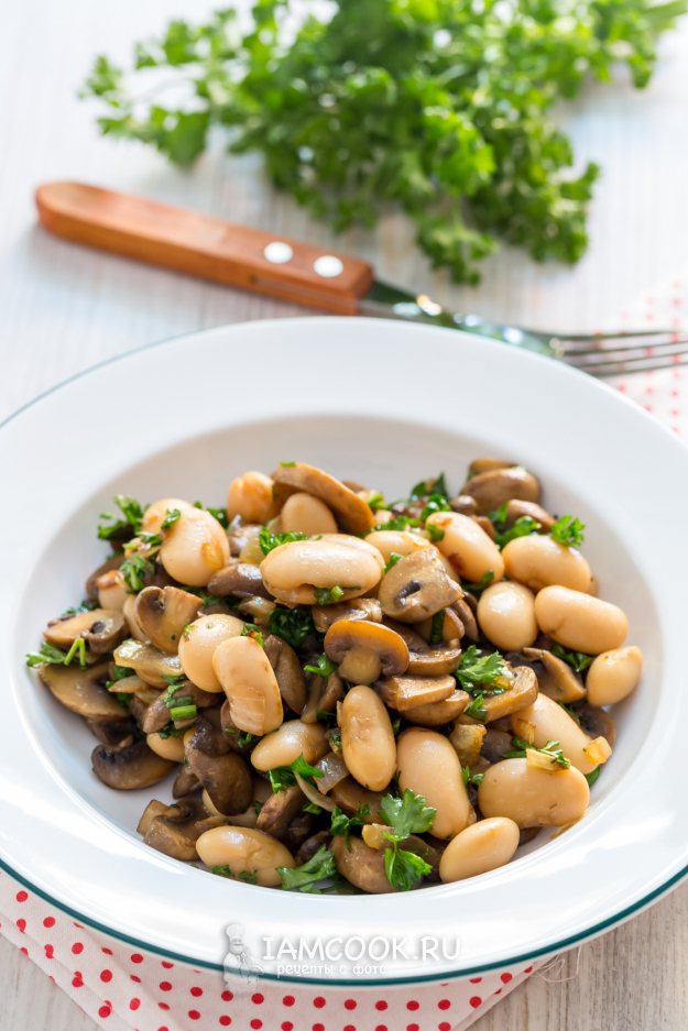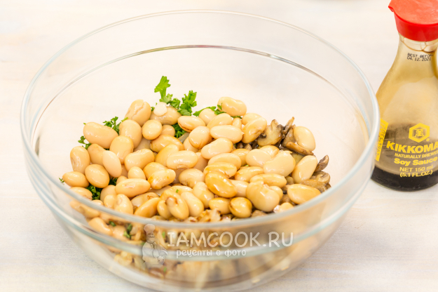 Продукты для приготовления салата с жареными грибами, фасолью и соевым соусом подготовьте по списку ингредиентов.