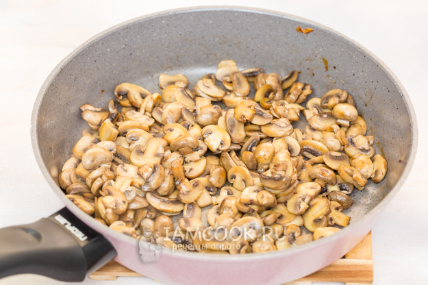 Грибы нарежьте и обжарьте, но уже без добавления масла. Они дадут много сока, жарьте до полного испарения жидкости.