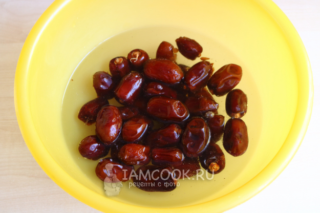 Финики зальём теплой водой до размягчения. На это обычно уходит от 15 минут до часа.