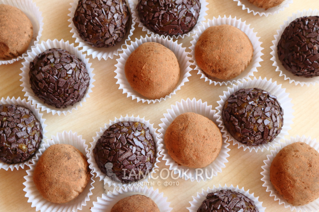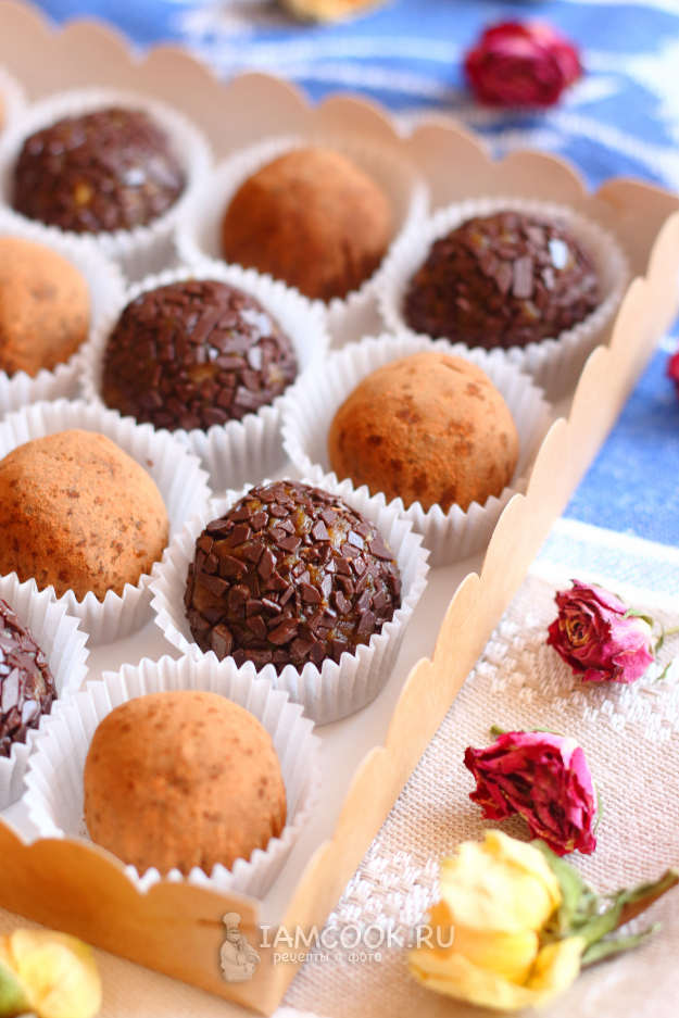 Обваляйте шарики в любимой посыпке. Я использую для конфет поровну обычное какао и кондитерскую шоколадную стружку (можно просто покрошить шоколад). Далее можно разложить изделия по специальным бумажным формочкам и запаковать в подарочную коробку. Либо же просто выложить на блюдо для подачи.
