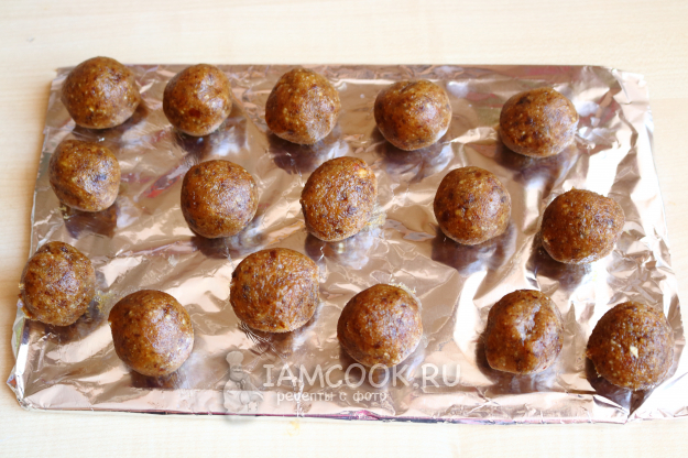 Смоченными водой руками сформируйте из массы шарики. Из данного количества ингредиентов получается 16 конфет по 20-25 граммов - это около чайной ложки на каждый шарик.