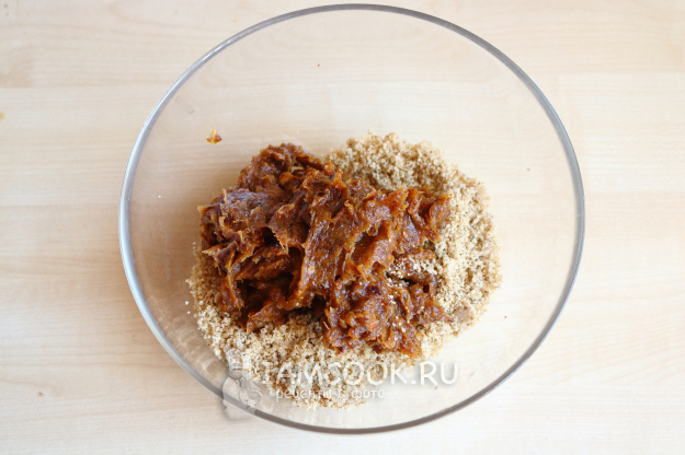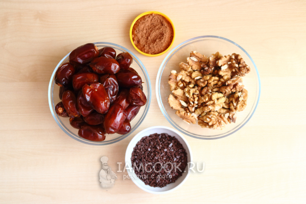 Для приготовления конфет из фиников и грецких орехов своими руками возьмём следующие компоненты. Я использую мякоть фиников и орехов в пропорции 3:1. Для этого фиников изначально беру чуть больше, чтобы после удаления косточки получилось нужное количество.