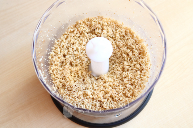 Тем временем грецкие орехи перемалываем блендером в мелкую крошку и перекладываем в миску для смешивания ингредиентов.