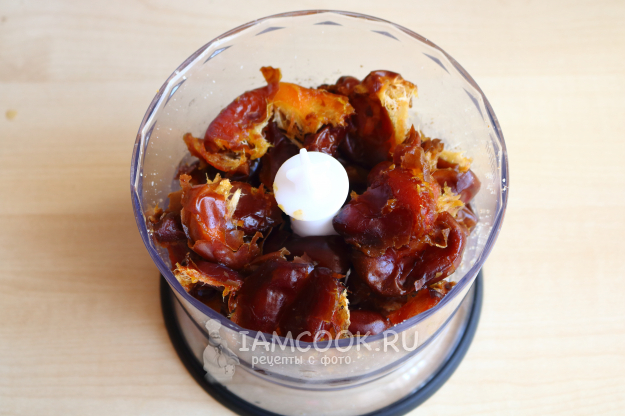 Размягченные финики очищаем от косточки и кожуры, если легко снимается, и выкладываем в чашу блендера.