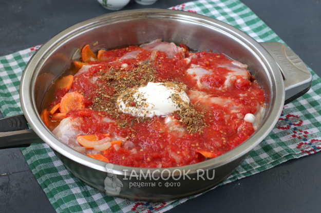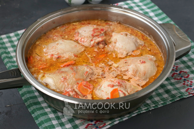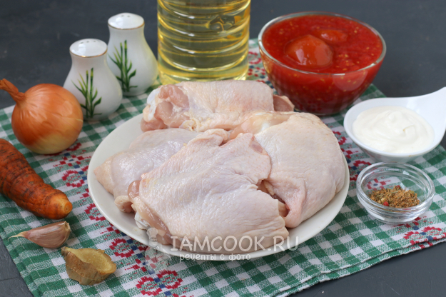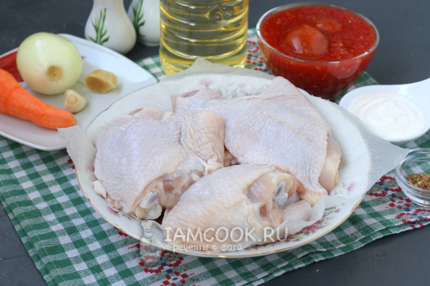 Для приготовления куриных бёдер в томатно-сметанном соусе подготовить из списка необходимые ингредиенты.