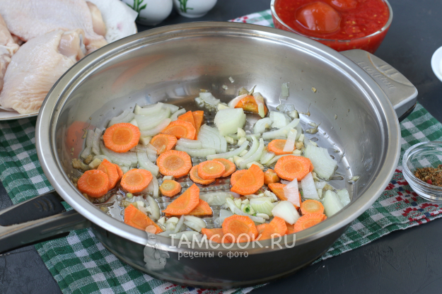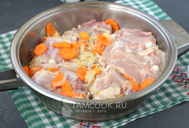 Овощи раздвинуть, и выложить в сковороду бёдрышки кожей вниз. Жарить 5 минут.