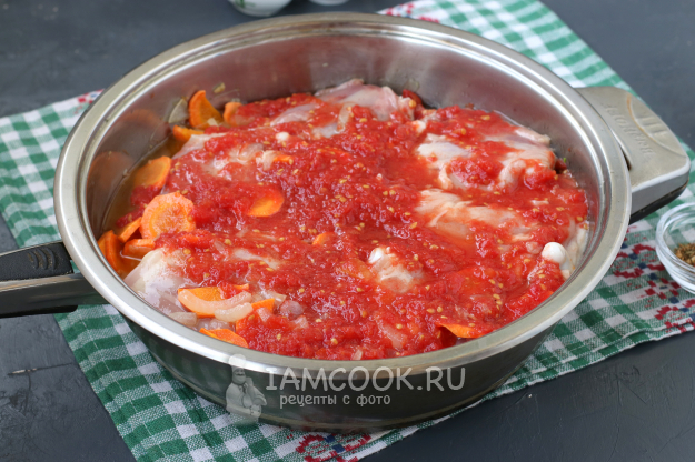 Измельчить в блендере томаты и добавить их в сковороду вместе с соком, в котором они находились.