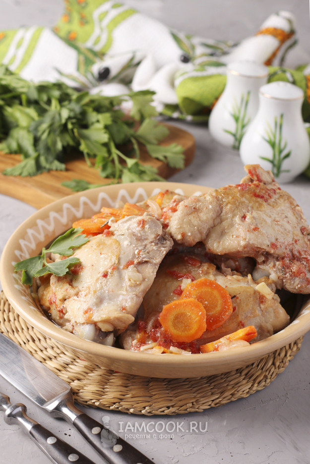Сковороду накрыть крышкой и готовить курицу 35 минут на небольшом огне. Спустя время мясо проткнуть вилкой: если она свободно входит в мякоть, курица готова.
