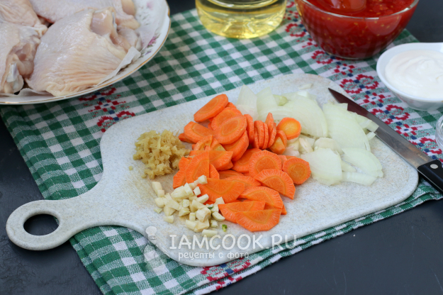 Куриные бёдра хорошо промыть и просушить на бумажных полотенцах. Почистить лук, морковь, чеснок и имбирь.