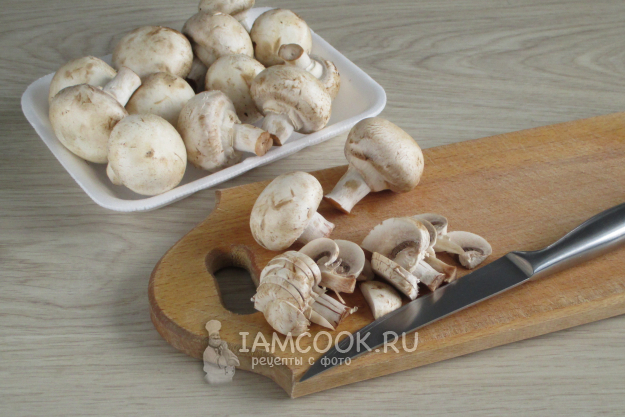 Свежие шампиньоны нашинкуйте или нарежьте кусочками.