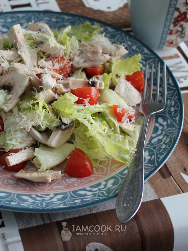 Иногда есть смысл сопроводить салат из свежих шампиньонов с помидорами и сыром отварным куриным филе.