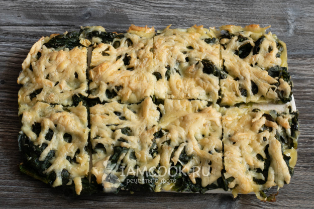 Дать запеченному шпинату с сыром остынуть до того, что он слегка затвердеет, или охладить полностью. Извлечь из формы и нарезать на порционные куски.