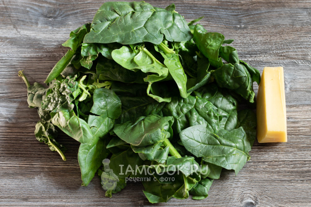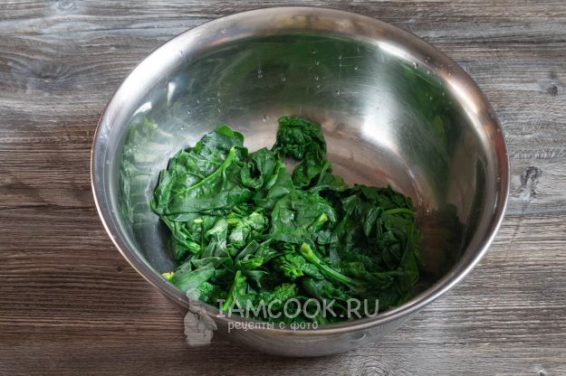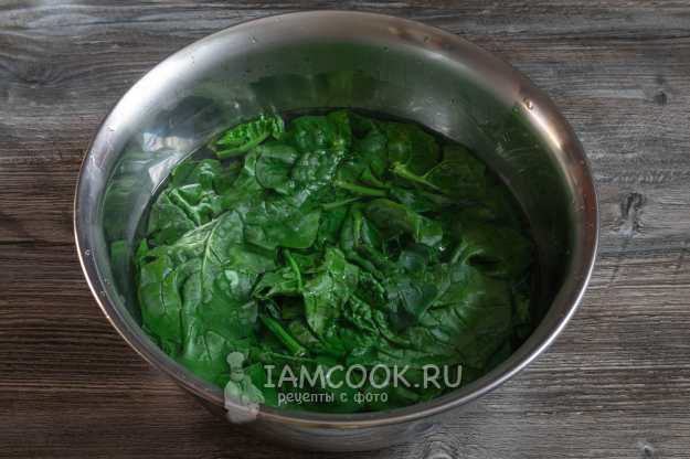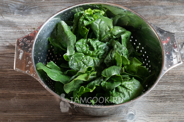 Шпинат хорошо промыть, оборвать особо грубые черенки листьев.