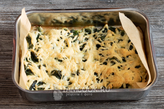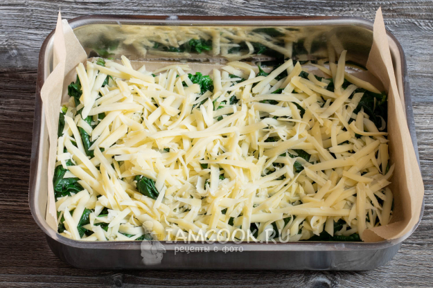 Выложить шпинат в плоскодонный огнеупорный лоток поверх слоя кондитерской бумаги.