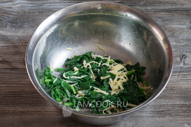 Шпинат залить кипятком и перемешивать, пока он не опадёт.